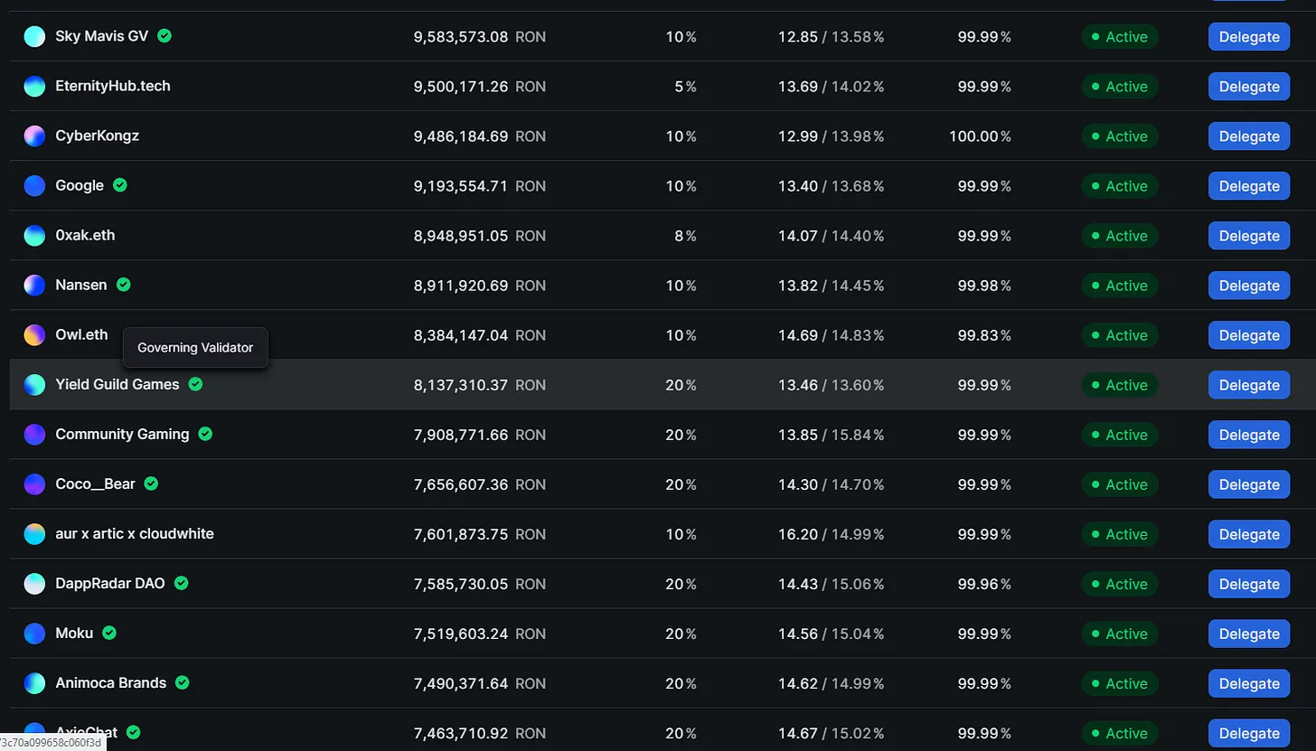 I pick validators that didn’t charge more than 10% fees and were outside the top 5 and ideally at least one of those was a governing validator (they have a green check beside their name), Sky Mavis GV, CyberKongz, Yield Guild Games, Nansen, Animoca Brands, all seem like decent options