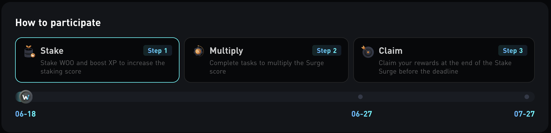 The more staked WOO and XP you have, the higher your score. Snapshots of staked WOO and XP will be taken each day so if you want to increase your daily average staking score during the Stake Surge - you can.