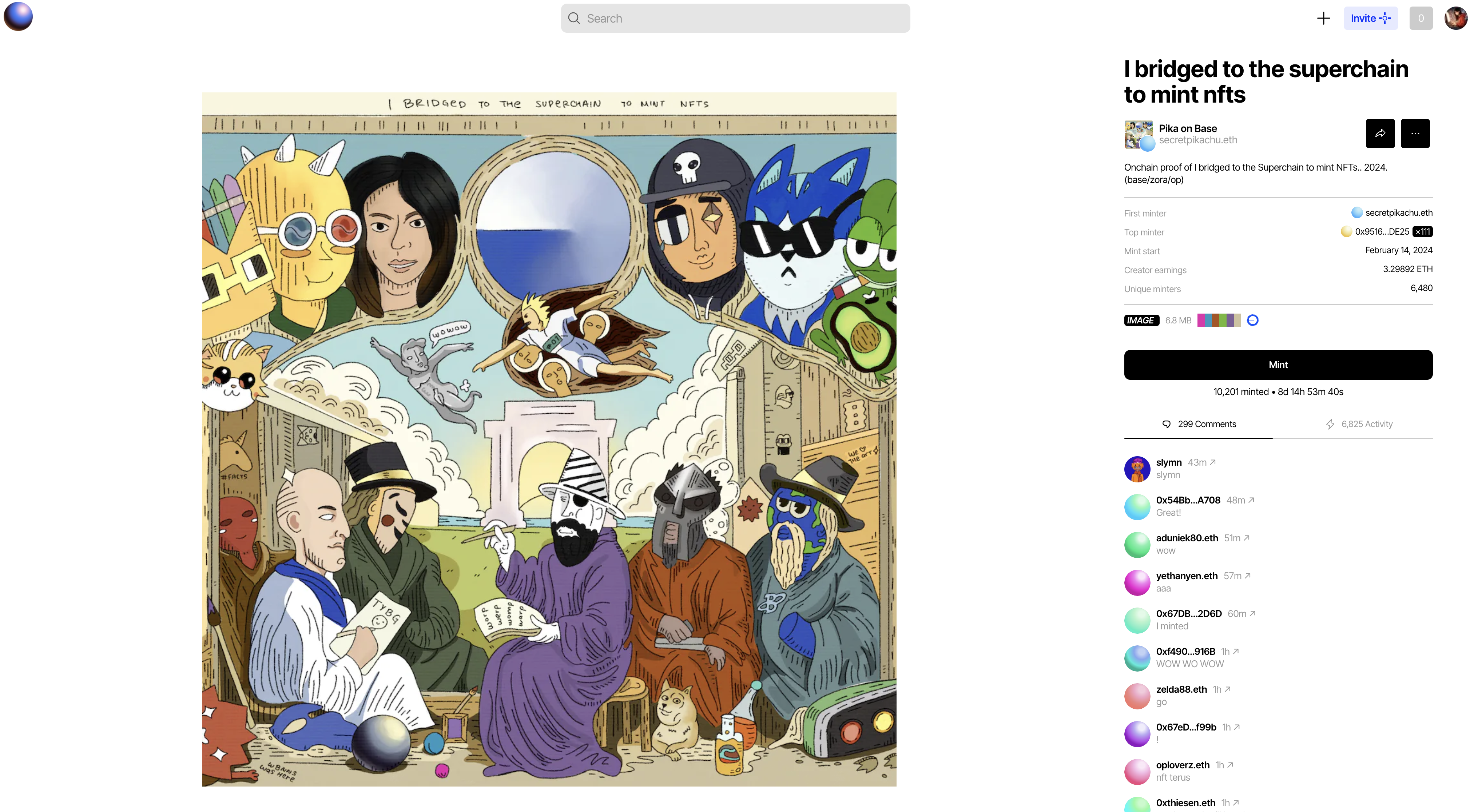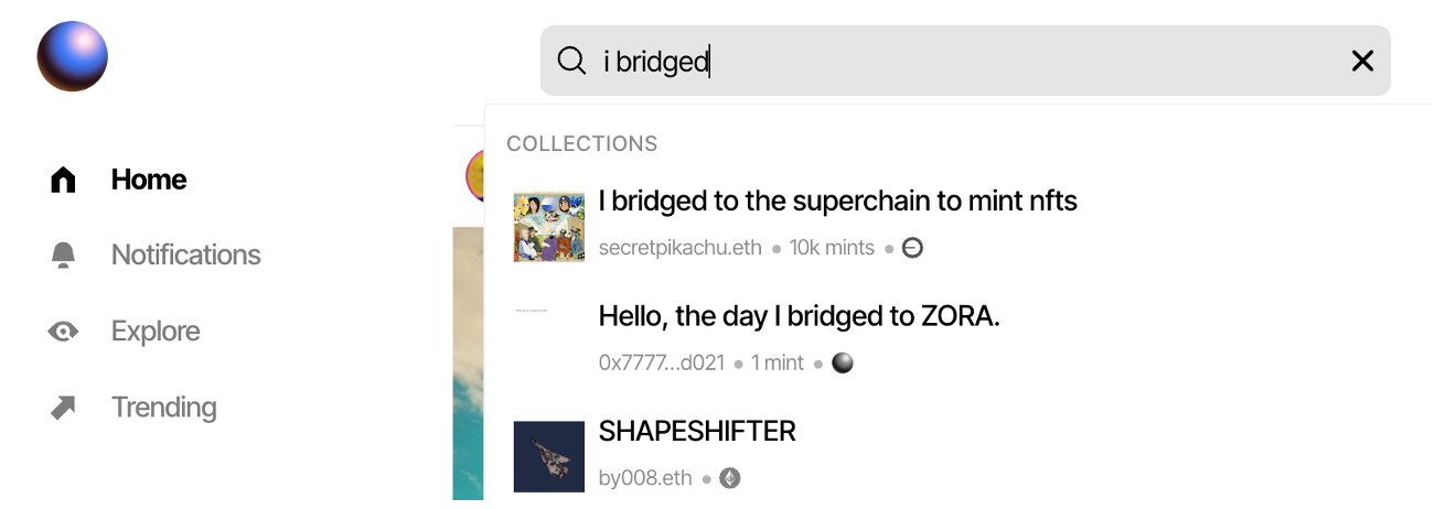 - If you already know which NFT you want to mint, simply use Zora’s search function to type the name of the NFT or its author and select it.