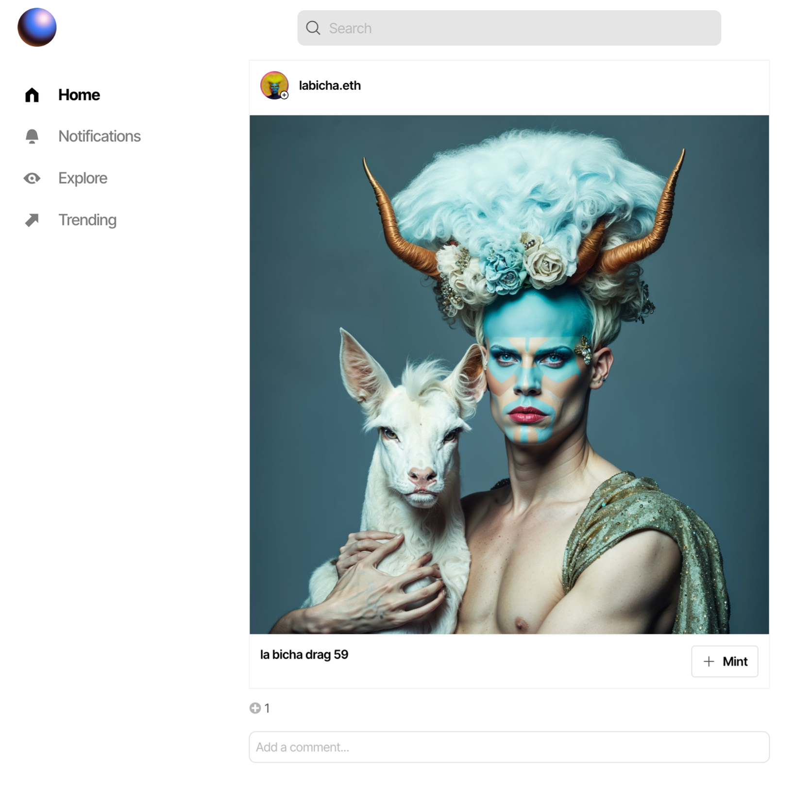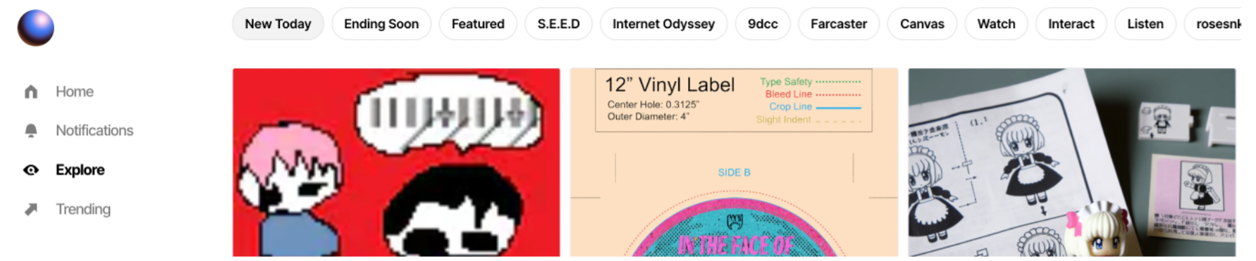 - HOME: on the main page, Zora displays some of the most recent and/or popular NFTs.