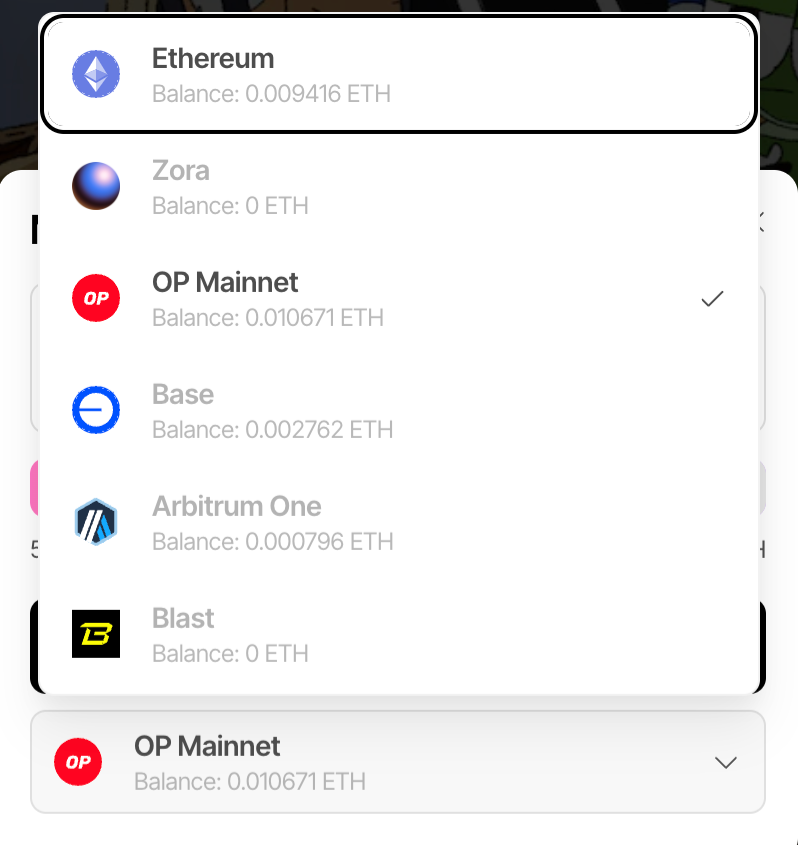 - You will need to select on which blockchain you want to mint that NFT. Zora will indicate the balance of ETH you have available on each of the blockchain options.