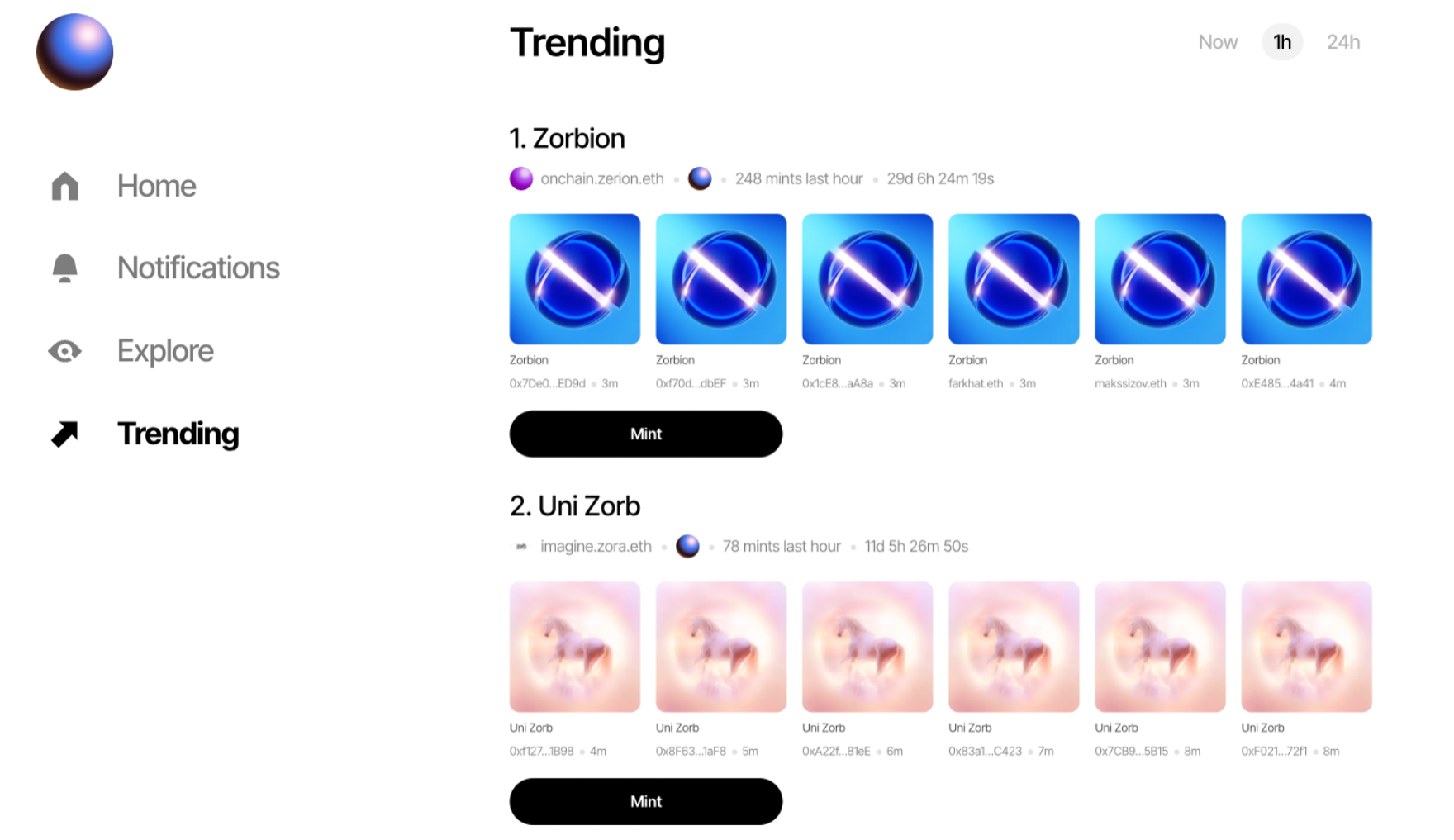 - TRENDING: here, Zora shows which NFTs are trending now, in the last hour, or in the last 24 hours.