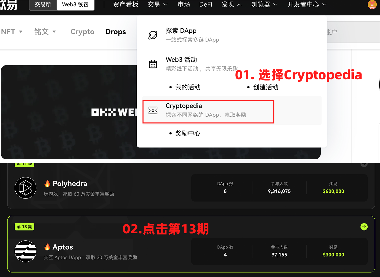 首先,我们点击发现模块,点击【Cryptopedia】,选择第13期即可进入任务界面~