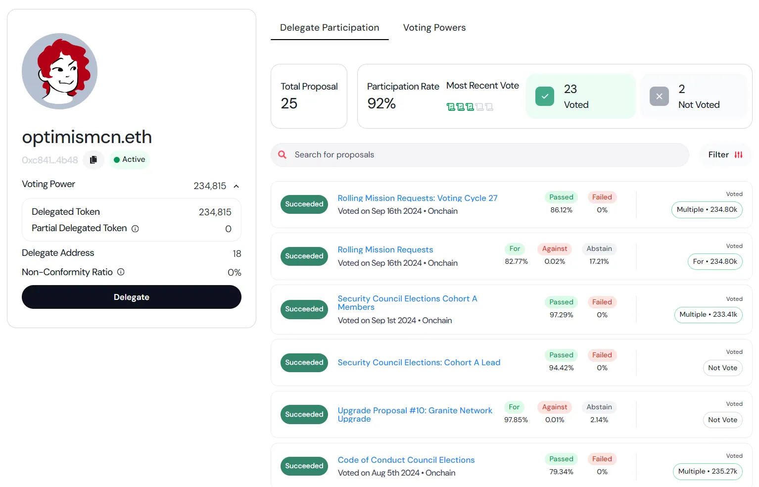 OP 中文力量目前 Delegate 数量 234 K+,排名 OP Delegate 第 53 名,感谢各位 OP 建设者的支持,我们将在此帖子更新我们的治理进展。我们也会帮助深度参与 OP 生态的团队提交 Mission Request,欢迎联系