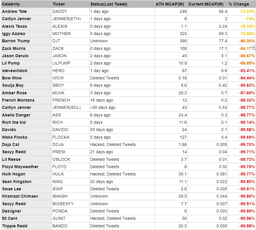 散户真正能从 Solana 上的模因币中实现收益变得越来越困难了。根据 0xngmi 的数据,大约 10 亿美元已被各种受益者吸走,包括 MEV、memecoin 启动板和 DEX。名人模因币曾经是播客上谈论最多的话题,但几乎所有的名人模因币都经历了超过 80% 的价格自由落体。他们的追随者不幸沦为灾难性价格暴跌的受害者。
