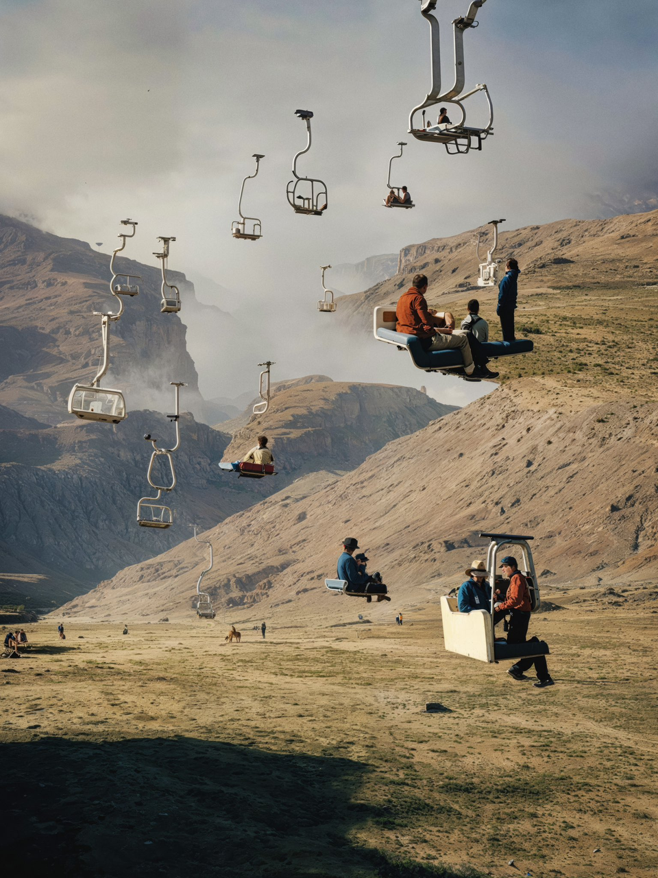 Vacation by Roope Rainsto: We can see many mistakes made by AI in creating this image, such as the floating cable car, the bizarre face in the lower right corner wearing an orange top, and the distorted, truncated legs. This aesthetic of AI flaws is intentional. It makes us think of alignDRAW, consider the strange architecture of the last century and the millennium, like Japan's Nakagin Capsule Tower, and recall the quirky designs of early mobile phones from Nokia, BlackBerry, and touchscreen mobiles. Back to AI art's old school, the roughness of the developmental process is more fascinating than the polished outcome.