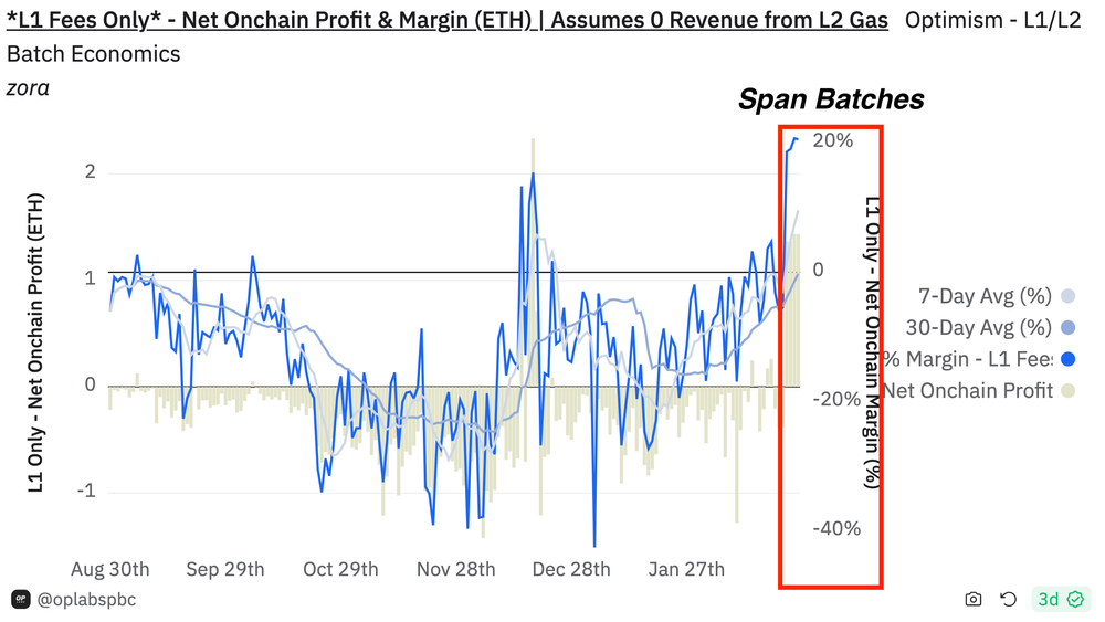 In der Praxis hat diese Reduzierung der fixen Gemeinkosten zu weiteren Vorteilen für die Betreiber der OP-Kette beigetragen. Im folgenden Beispiel sehen Sie, dass der Nettogewinn von Zora seit der Einführung von Span Batches erheblich gestiegen ist und konstant geblieben ist.
