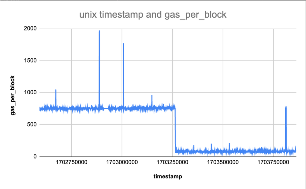 Basierend auf unseren Backtesting-Ergebnissen haben wir erwartet, dass das Delta-Upgrade den fixen Overhead für die L1-Gebühren aller OP Chains um 6%~11% für performante Chains und über 90% für weniger aktive Chains senken würde. Wir waren in der Lage, noch mehr Optimierungen durchzuführen, um den festen Onchain-Overhead für Chainoperatoren zur Ausführung jeder Standard-OP-Chain um über 90 % zu reduzieren. Wir freuen uns, berichten zu können, dass diese Zahlen auch nach dem Upgrade unverändert geblieben sind. Zora-sepolia bietet eine schöne Visualisierung der 90%igen Reduzierung der fixen Onchain-Kosten. Hier sind sie eine Woche vor und eine Woche nach dem Testnet-Upgrade im Dezember 2023: